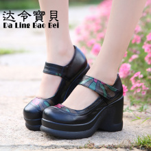 达令宝贝春秋新款真皮女单鞋坡跟高跟鞋民族风厚底松糕鞋女鞋