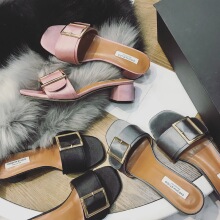 欧洲站2017新款拖鞋女夏中跟粗跟方头单鞋真皮方扣方跟露趾女凉鞋