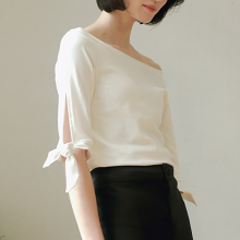 简约露锁骨一字领五分袖系带T恤女修身显瘦纯色打底衫上衣百搭夏