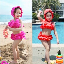 2017韩版夏季女童泳衣可爱荷叶边比基尼分体式泳衣带泳帽儿童泳衣