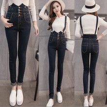 春秋时尚可拆卸高腰牛仔背带裤女韩版修身学生连体吊带裤铅笔长裤