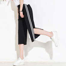 2017夏韩版宽松侧边条纹阔腿裤七分裤开叉休闲直筒运动裤女潮