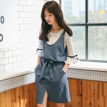 休闲背带裙夏季韩国女装系带少女喇叭袖条纹女生连衣裙学院风女裙