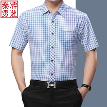 秦牌男装夏季中年男士格子丝光棉免烫衬衣中老年男士宽松短袖衬衫