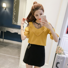 假两件雪纺衫女2017夏装韩版宽松显瘦网纱拼接荷叶边百搭短袖上衣