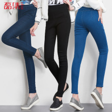 磊集大码女装2017新款春牛仔裤女显瘦小脚裤松紧腰深蓝色牛仔裤女