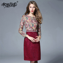水墨青华 2016秋冬新款气质通勤女装拼接复合蕾丝钉珠连衣裙