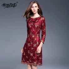水墨青华2016秋季新款时尚修身气质七分袖圆领网纱绣花蕾丝连衣裙
