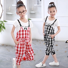 儿童格子连体裤套装薄款女童背带七分裤两件套夏季T恤女孩格子裤
