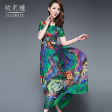 欧莉瑾 品牌女装时尚印花真丝连衣裙2016夏新款波西米亚长裙大摆