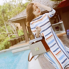 【介面高端原创女装】春夏装真丝条纹优雅中袖中长款一字领连衣裙