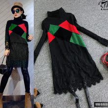 2017中长款打底裙高领加厚春季韩版时尚拼接蕾丝显瘦长袖连衣裙