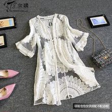 春装蕾丝纱网钩花开衫外搭中长款外套女大码宽松薄款七分袖防晒衣