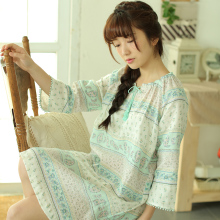 春夏新款七分长袖纯棉纱布睡裙 波西米亚薄款睡衣中裙家居裙子