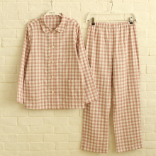 春秋季圆领睡衣女纯棉双层纱布长袖薄款全棉格子日系家居服女套装