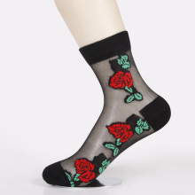 女士中腰蕾丝水晶袜子 女夏季超薄透肉玻璃丝袜 清新花朵透气女袜