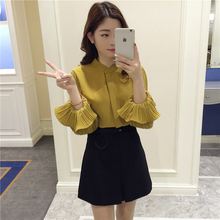 2017韩版新款百褶喇叭袖雪纺衬衫+半身短裙两件时尚裙子套装女潮