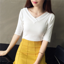2017春夏新款韩版修身显瘦薄款冰丝针织衫上衣百搭纯色V领T恤女潮