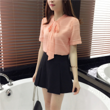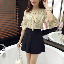 2017韩版新款蝴蝶结系带雪纺衫短裙休闲两件时尚气质套装女夏季潮
