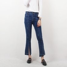 2017时尚新款牛仔裤 宽松合身剪烂九分喇叭裤