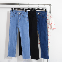 春夏新款高腰九分喇叭牛仔裤女2017夏季弹力显瘦毛边流苏微喇叭裤