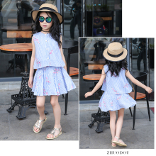 女童时尚套装2017夏季韩版条纹无袖背心碎花裙子儿童半身裙两件套
