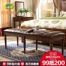 意舍 美式床尾凳 美式换鞋凳实木雕花布艺做旧白蜡木全实木软包