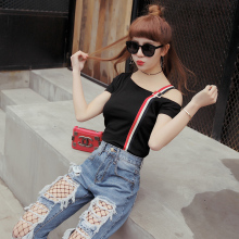 露肩上衣女2016新款韩版夏季学生短袖性感显瘦条纹紧身漏肩t恤女