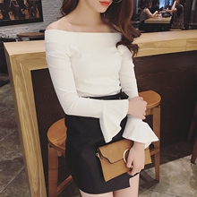 2016款秋装显瘦性感长袖紧身t恤女短款修身喇叭袖露肩针织上衣潮