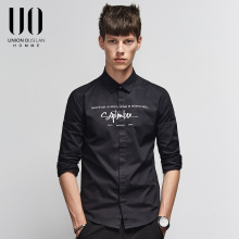 UO男士长袖衬衫 2016秋装新品欧美简约字母印花全棉衬衣黑衬衫男