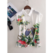 翻领真丝女t恤 ol简约气质通勤蚕丝上衣 小鸟印花短袖真丝小衫女