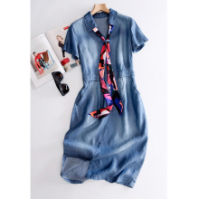 高端大牌修身牛仔连衣裙 柔软舒适飘带短袖牛仔裙 长款衬衫裙2017