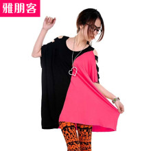 胖MM加肥加大码女装短袖T恤时尚个性露肩蝙蝠袖中长显瘦200斤上衣
