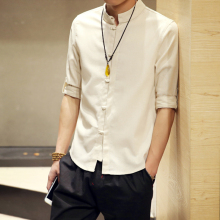 夏季中国风男装复古盘扣七分袖衬衫男士棉麻立领唐装亚麻衬衣男潮