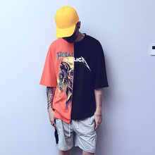 夏季原创潮牌不规则撞色拼接短袖T恤男暗黑街头嘻哈宽松五分t半袖