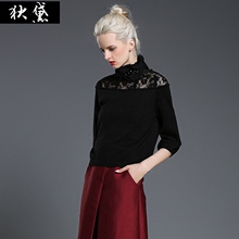 狄黛春秋高领女装 蕾丝拼接网纱黑色亮丝性感长袖透视打底衫薄