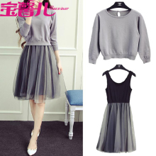 秋装新款毛衣针织衫连衣裙两件套装女 中长款网纱蓬蓬裙打底裙子