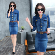2017夏季新款时尚牛仔连衣裙女修身V领七分袖显瘦收腰包臀一步裙