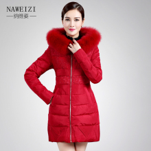 纳维姿连帽狐狸大毛领修身中年中长款妈妈装羽绒服女蕾丝外套冬装