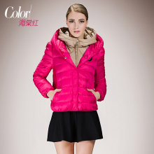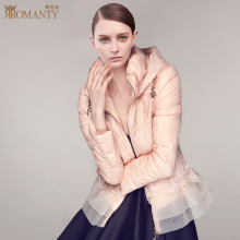 朗曼笛 2016冬季新款蕾丝轻薄A字羽绒服女短款粉色 宽松连帽外套