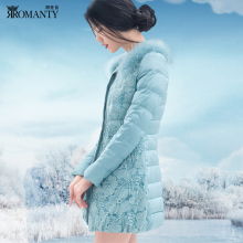 朗曼笛冬季轻薄品牌蕾丝羽绒服女中长款宽松 女士A字型连帽厚外套