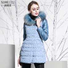 纳维姿2016冬装新PU拼接蓝色羽绒服女中长款 修身貉子毛领羽绒衣