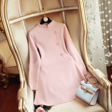 2016秋冬中国风复古立领盘扣长袖针织改良旗袍修身大摆A字连衣裙