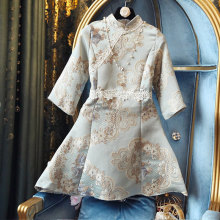 2016冬季新款西洋烫金刺绣中式复古改良旗袍修身A字七分袖连衣裙