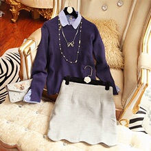 2016秋冬新款韩版长袖打底衬衫+毛衣+毛呢花瓣波浪半身裙三件套女
