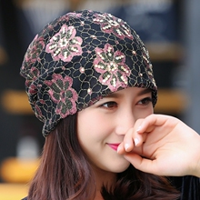 韩版潮帽子女夏薄款蕾丝花朵头巾围脖两用镂空调月子化疗堆堆睡帽