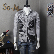 2017秋季新款 韩版奢华气质英文涂鸦 纯棉青年长袖衬衫休闲花衬衣