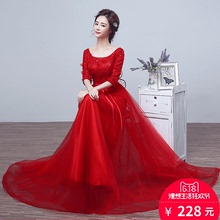 礼服敬酒服2017春季新款新娘结婚长款红色一字肩中袖晚礼服长裙女