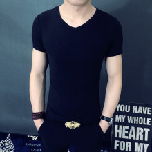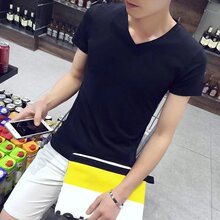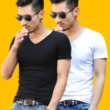 夏季男士体恤短袖V领修身薄款纯棉半袖青年纯色冰丝紧身弹力t恤男