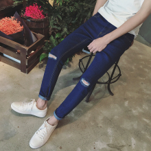 2016冬季青年牛仔裤男士韩版潮流修身型小脚裤破洞紧身显瘦长裤子